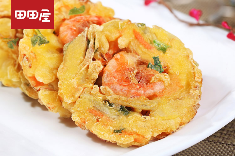 受到日本天婦羅的啟發(fā),田田屋將白對(duì)蝦、牛蒡、胡蘿卜、茼蒿、洋蔥等各色蔬菜巧妙配比,經(jīng)過(guò)調(diào)味、掛糊、油炸,烹制出風(fēng)味獨(dú)特的米蘭蝦餅,不僅口感酥脆,香味濃郁,更有整顆大蝦鑲嵌其中,令人大感Q彈過(guò)癮,新鮮爽口,好吃不膩。