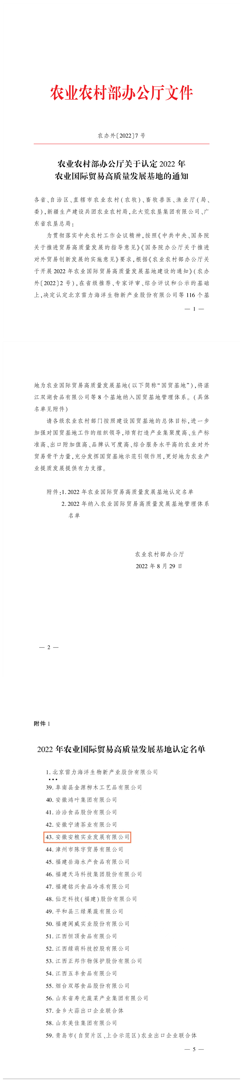 熱烈祝賀!安糧實業(yè)被農業(yè)農村部認定為2022年農業(yè)國際貿易高質量發(fā)展基地!