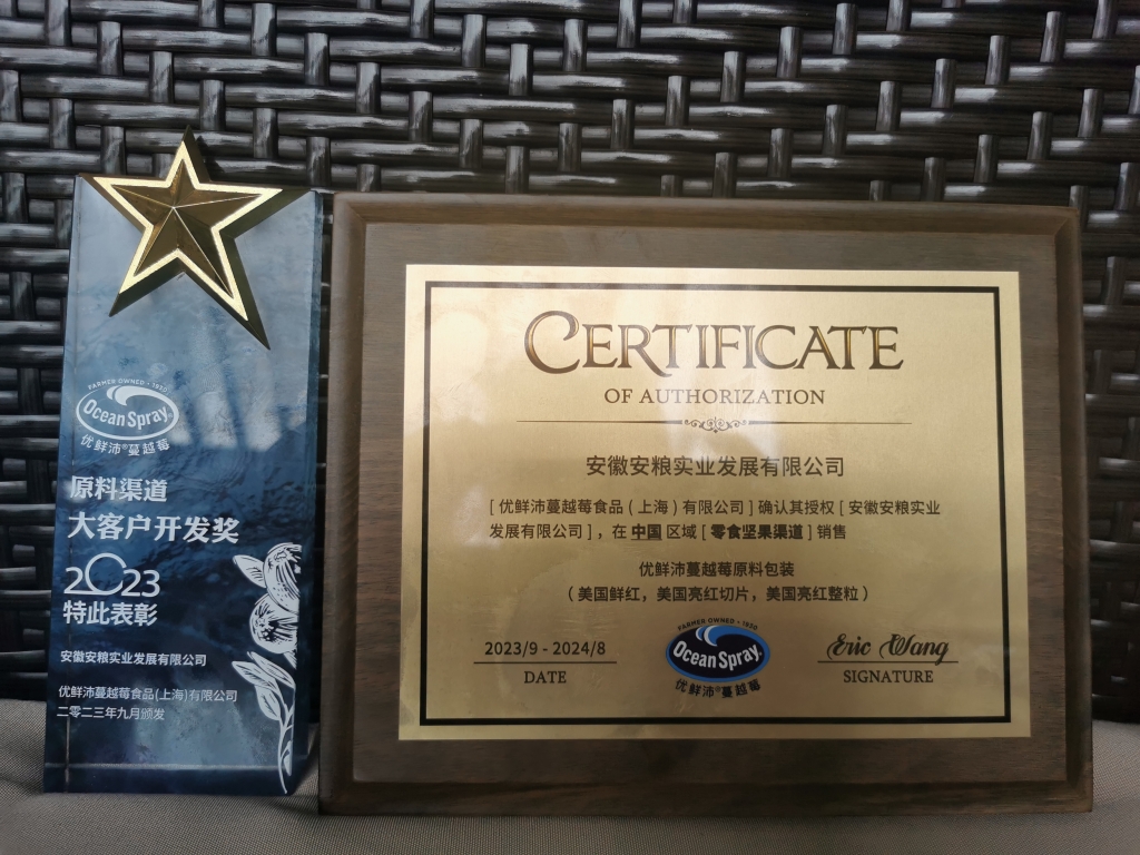 安糧實(shí)業(yè)獲得優(yōu)鮮沛品牌授權(quán),并榮獲“大客戶開發(fā)獎(jiǎng)”,不僅是對(duì)安糧實(shí)業(yè)在休閑食品原料領(lǐng)域?qū)I(yè)性的認(rèn)可,也是對(duì)我司市場(chǎng)開拓能力的信任。通過共享資源、互換優(yōu)勢(shì),安糧實(shí)業(yè)與優(yōu)鮮沛將共同推動(dòng)休閑食品行業(yè)的發(fā)展,為廣大消費(fèi)者帶來更多美味、健康的休閑食品,未來安糧實(shí)業(yè)與優(yōu)鮮沛的合作會(huì)讓更多客戶能采購(gòu)到高品質(zhì)休閑食品原料和新鮮蔓越莓產(chǎn)品。